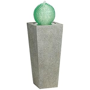 This beautiful outdoor fountain features a square resin column topped by a eye-catching glass globe. It comes in a faux stone finish and features light and sturdy cast resin construction. The included solar cell powers the fountain, or you can plug it into a standard outlet. Once it becomes dark, the built-in solar cells will power the fountain for two additional hours.